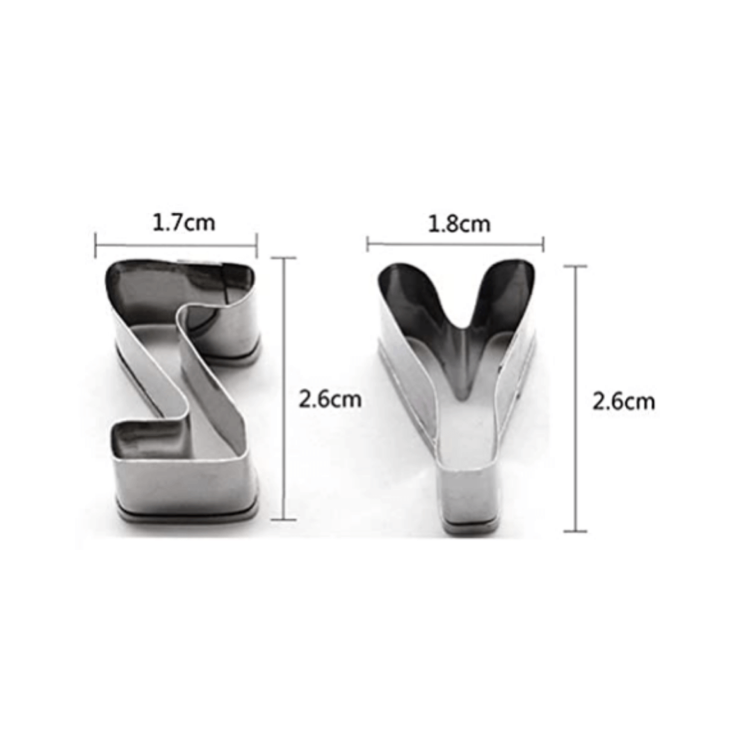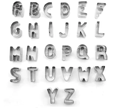 Alphabet Cookie Cutters includes all 26 letters. Perfect to use in the kitchen for baking cookies or decorating a cake, in the studio with clay, or even at the kids table with playdoh.