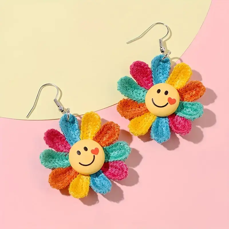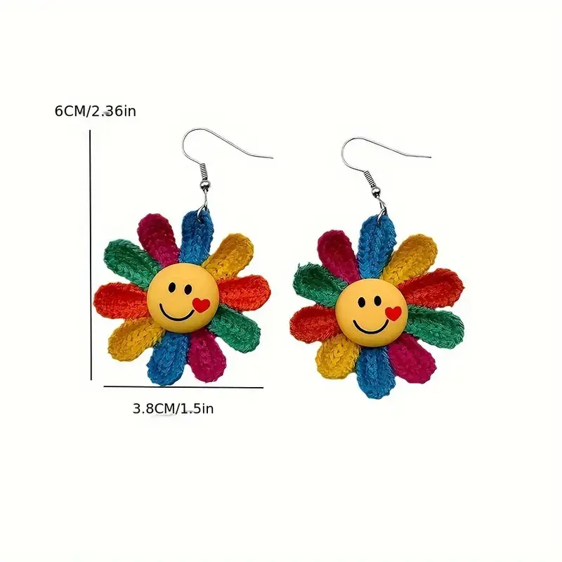 These are colorful, sunflower-shaped dangle earrings with a smiling face design are cute/romantic and sweet with a plant shape/pattern.