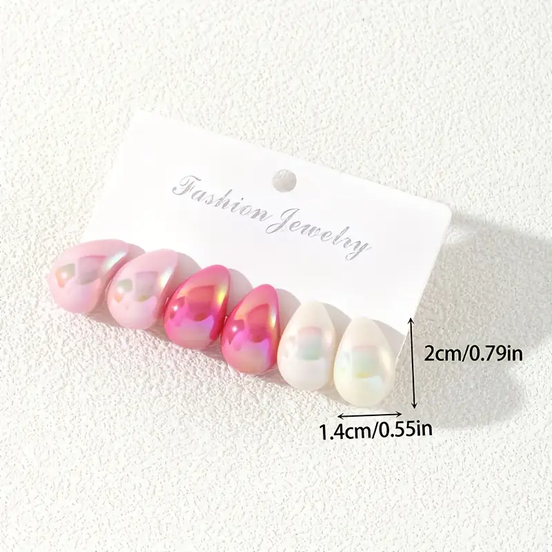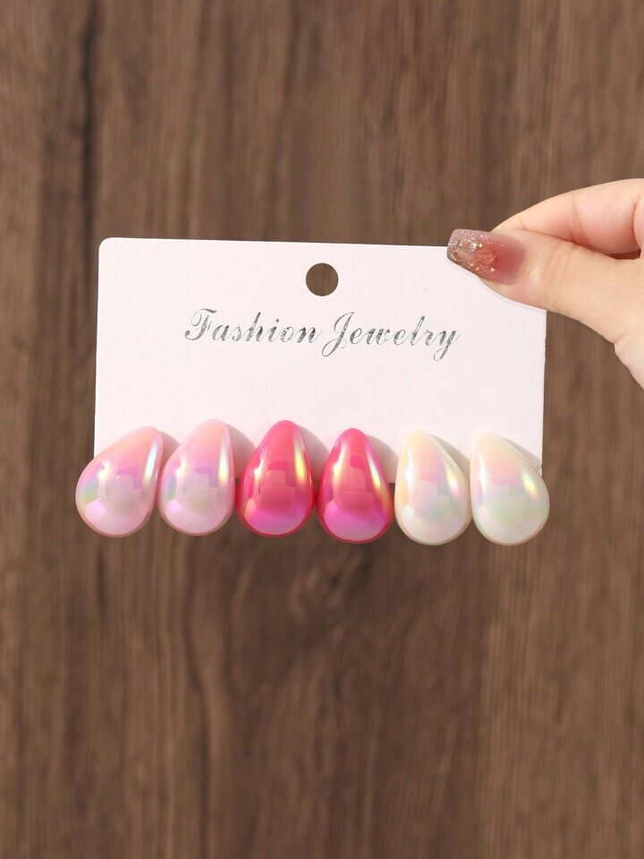 Add a pop of color and shine to your look with this stunning set of teardrop-shaped stud earrings. This 3-pack set boasts a unique shade – from a soft pastel pink and pearlescent white to vibrant hot pink – perfect for mixing and matching with any outfit.
